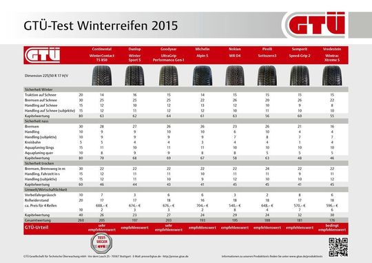 Das breite Feld der Winterreifen mit der Testbewertung „empfehlenswert“ beginnt mit dem Drittplatzierten, dem ebenfalls neuen Dunlop Winter Sport 5. Nur knapp dahinter mit wenigen Punkten Abstand liegen der Nokian WR D4 und der Michelin Alpin 5. Der Pirelli Sottozero3 und der Semperit Speed-Grip 2 belegen die Plätze sechs und sieben in der Gesamtwertung. Schlusslicht im GTÜ-Winterreifentest 2015 mit einem „bedingt empfehlenswert“ ist der Vredestein Wintrac Xtreme S, der wegen seinen wenig überzeugenden Leistungen auf nasser Fahrbahn auf dem achten Platz landet.