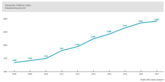 Der Deutsche Oldtimer Index des VDA hat 2017 um 1,4 Prozent zugelegt. Die Wertsteigerung klassischer Fahrzeuge lag somit unterhalb der Inflationsrate.
